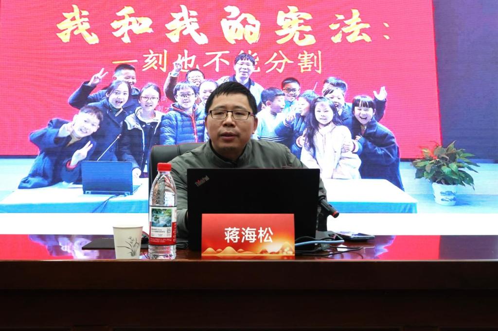 讲座伊始,蒋海松以本次宪法集市、法治咖啡、现代盲盒等趣味普法活动为切入点,引出宪法日的重要意义。他指出宪法不仅是治国安邦的总章程,更是保障公民权利、规范国家权力的基石,强调了宪法作为国家根本大法的重要地位。他提到:“宪法像一条精神纽带,将我们大家紧紧维系在一起。”