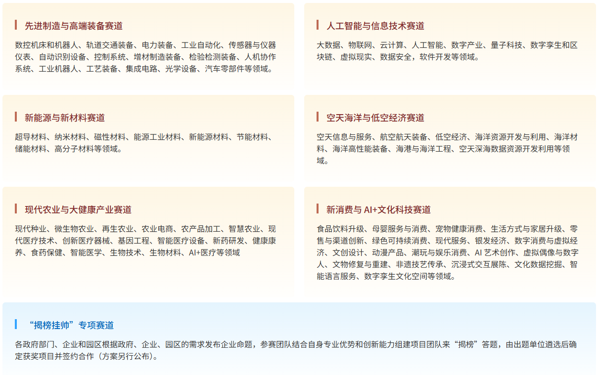 精准对接湖南“4×4”现代化产业体系与产业发展趋势,设置先进制造与高端装备、人工智能与信息技术、新能源与新材料、空天海洋与低空经济、现代农业与大健康产业、新消费与 AI+文化科技等6个主赛道(含海外)和1个“揭榜挂帅”专项赛道。