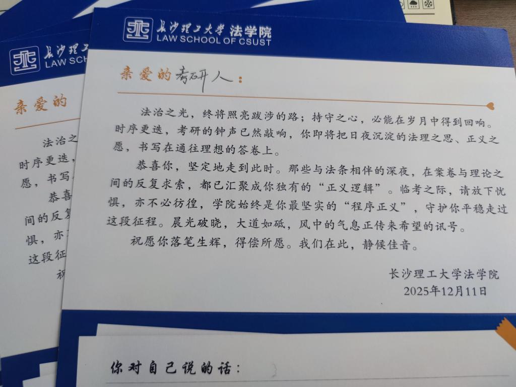 本次活动以“温情关怀+精准赋能”为核心,既传递了学院对考研学子的深切关爱,也为冲刺阶段的学子提供了考前指导,有效凝聚了奋进力量、提振了备考士气,愿全体考研er们在法途路上步履坚定、折桂研途!