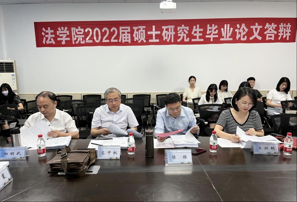 6月2日下午13:00,法学院2022届硕士研究生学位论文答辩会在金盆岭校区7号教学楼319室、308室、305室如期举行。本次学位论文答辩分为三组,并邀请到湘潭大学王霞教授、湖南工业大学陈雄教授、湖南金湘律师事务所陈醒律师作为校外专家担任答辩委员会主席,法学院十余位硕士生导师组成答辩委员会进行评定。20级、21级研究生到场旁听学习。
