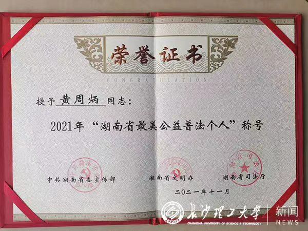 我院教师、中国民主建国会长沙市委副主委黄周炳获评2021年度湖南省“最美公益普法个人”。长期以来,黄周炳老师坚持开展普法宣传工作,指导学生成立“法学协会”“法律咨询社”等学生社团,长期指导学生开展法治宣传系列实践活动,经常组织开展校园普法讲座,邀请明星警官现身说法,指导制作校园普法系列栏目剧“小权说法”,构建了“长理法律宣传月”品牌。他还坚持用法律知识服务社会,定期义务开展法律知识讲座,带领学生深入社区进行法律知识宣传,无偿为弱势群体维权,先后为困难企业提供法律援助30余次,挽回经济损失近5000余万元,义务提供法律咨询1000余次,免费给30多个单位讲授法治课50多场次。同时他积极履行长沙市人大代表职责,提出关于“加强企业法治环境,实现亲清政商关系法治化”的建议得到省市领导批示。