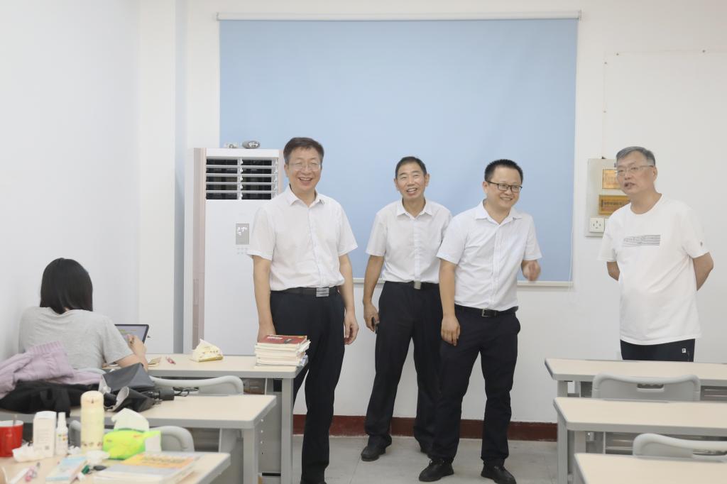 8月24日上午,校党委书记付宏渊,校长曹一家,副校长谈传生、胡永乐、曾祥君、钱国平,党委委员、宣传部部长方琼及相关职能部门负责人到法学院新办公地址4号教学楼检查新学期开学工作,院党总支书记田兴洪、院长张敏纯等党政班子成员迎接和陪同检查。