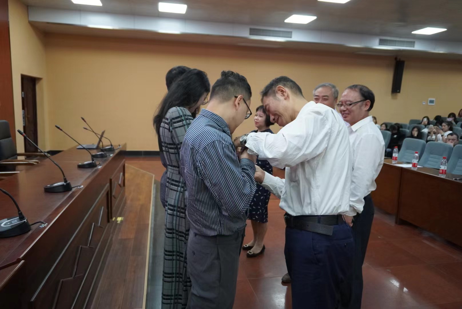 “我们几位都是60后,从事教师工作的时间也就和今年新入职的老师们年龄差不多”,高中权、阳明武、田兴洪、杜卫红等四名老师从1987年开始,先后走上三尺讲台,四季春秋见证了他们青丝到白发、桃李满天下的从教历程。宋家骏、尹迪、黎梦兵、邓欣欣等四名青年博士,作为学院新入职教师,他们从老教师们手中接过教书育人的接力棒,佩戴上“人民教师”的光荣徽章,从此开启赓续育人的新时代师道传承路。
