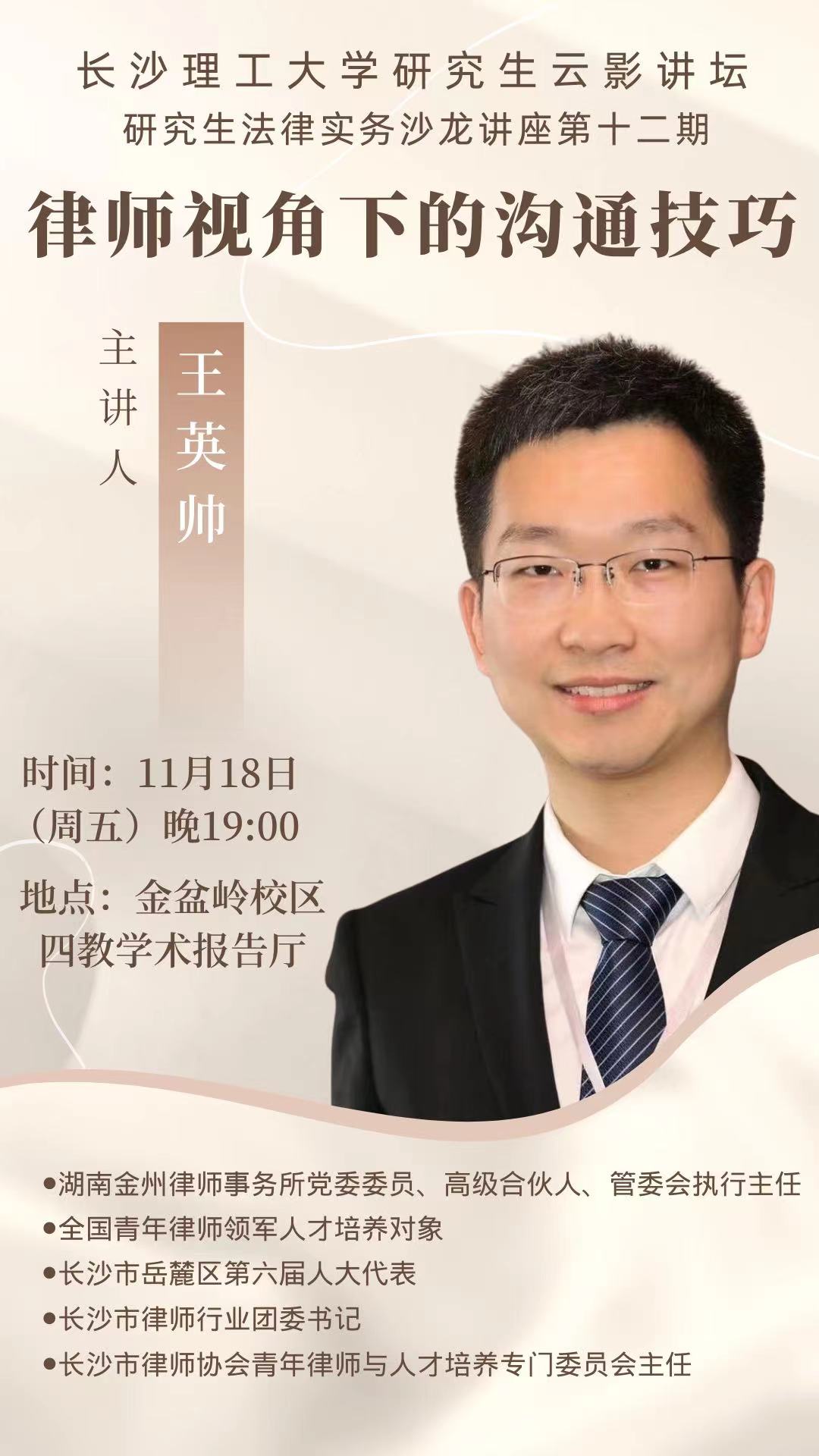 为拓展学生法律视野,提升青年学生的综合能力,11月18日,威廉体育williamhill法学院“云影讲坛研究生法律实务沙龙”第十二期如期举行。本期以《律师视角下的沟通技巧》为主题,由湖南金州律师事务所王英帅律师主讲,我院杜卫红老师担任讲座主持人,我院田兴洪书记出席本次讲座,240余名学生聆听讲座。