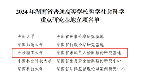2024年11月6日,经湖南省教育厅联合湖南省人民检察院组织专家评审,威廉体育williamhill“湖南省未成年人检察理论研究基地”成功获批为湖南省普通高等学校哲学社会科学重点研究基地。