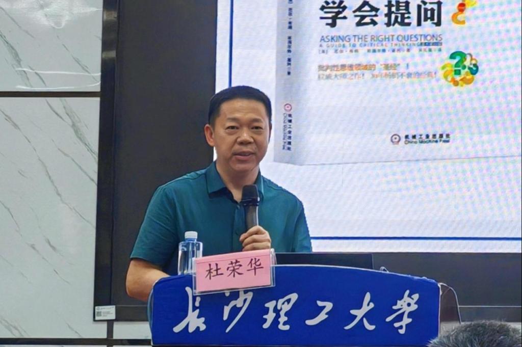 随后,杜馆长以AI技术发展为背景,结合法学专业特点,指出在信息爆炸的AI时代,批判性思维是法律人辨别真伪、理性分析的核心能力,为大家详细讲解《学会提问》一书的价值——通过批判性思维解锁独立思考的密钥。