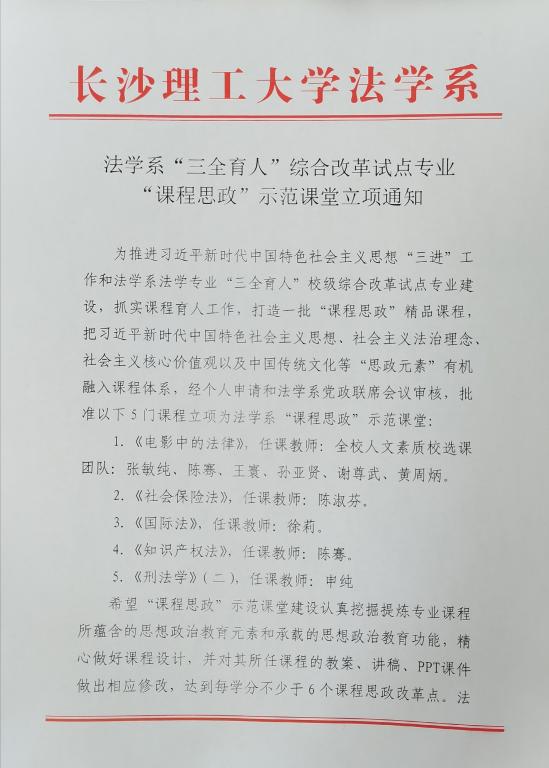 法学系“三全育人”综合改革试点专业“课程思政”示范课堂立项通知