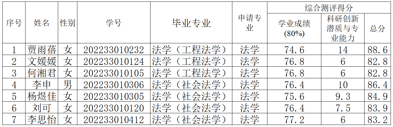 现予以公示,公示期为2025年9月9日至2025年9月11日。如对综合测评成绩有异议,请于公示期内实名并书面向法学院教务办反映,联系电话:85115218,联系人:何老师