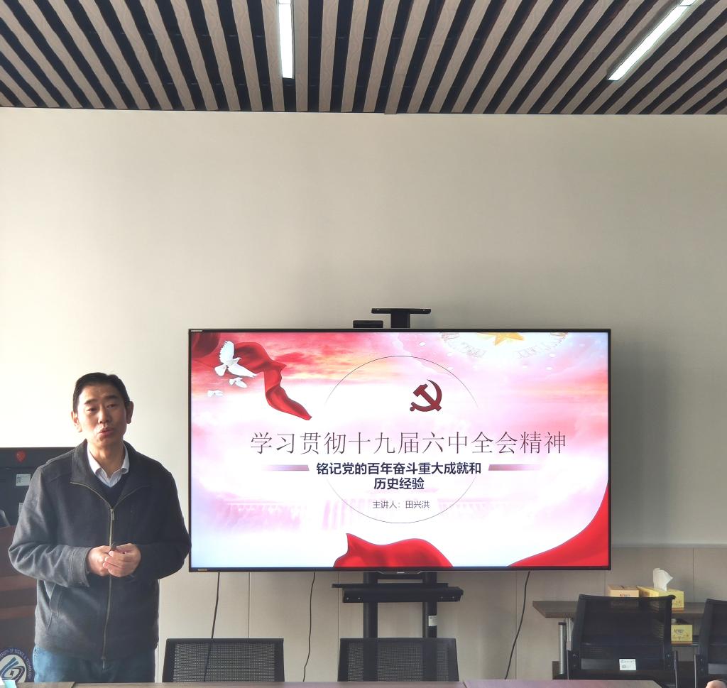 院党总支书记田兴洪作题为《学习贯彻党的十九届六中全会精神,为学校决胜建成“百强”大学做贡献》的学习辅导报告。报告从全会的重要内容、《中国共产党第十九届中央委员会第六次全体会议公报》的主要内容、《中共中央关于党的百年奋斗重大成就和历史经验的决议》的简要解读等三个方面,对全会精神进行较为细致、深入的解读。他指出,全会对我党百年历程的总体评价,一言以蔽之,即“党和人民百年奋斗,书写了中华民族几千年历史上最恢宏的史诗”;在党的百年浴血奋斗中,全党要坚持唯物史观和正确党史观,要更加坚定、更加自觉地践行初心使命,在新时代更好坚持和发展中国特色社会主义;围绕“为实现中华民族伟大复兴”主题对四个历史阶段做出评价;一百年来,党领导人民进行伟大奋斗,积累了宝贵的历史经验,这就是:坚持党的领导、坚持人民至上、坚持理论创新、坚持独立自主、坚持中国道路、坚持胸怀天下、坚持开拓创新、坚持敢于斗争、坚持统一战线、坚持自我革命;今后百年全党要牢记中国共产党是什么、要干什么这个根本问题,把握历史发展大势,坚定理想信念,牢记初心使命,始终谦虚谨慎、不骄不躁、艰苦奋斗,不为任何风险所惧,不为任何干扰所惑,决不在根本性问题上出现颠覆性错误,以咬定青山不放松的执着奋力实现既定目标,以行百里者半九十的清醒不懈推进中华民族伟大复兴。