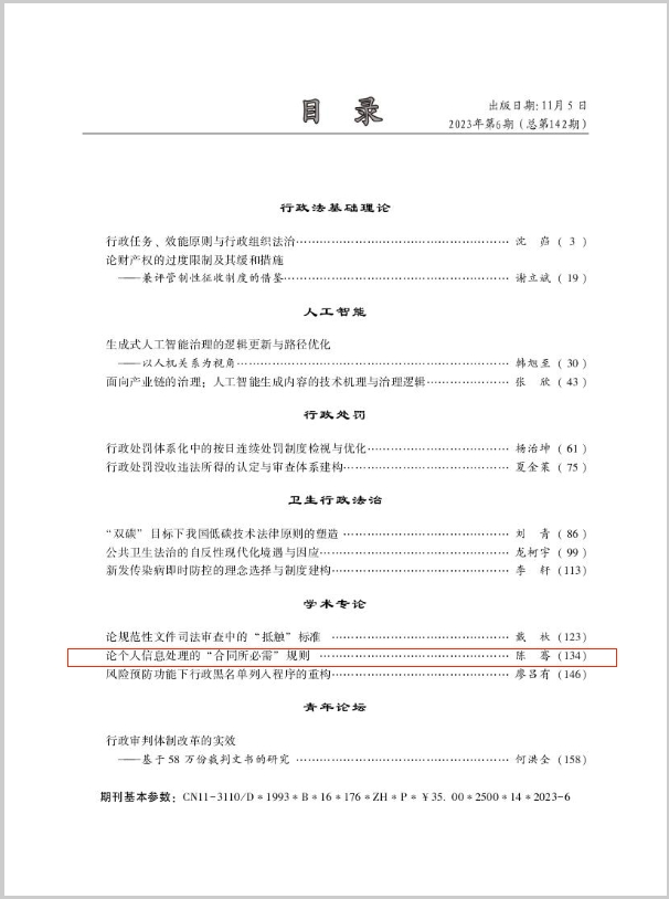 近日,威廉体育williamhill法学院讲师陈骞在《行政法学研究》(CSSCI来源期刊)2023年第6期发表论文《论个人信息处理的“合同所必需”规则》。