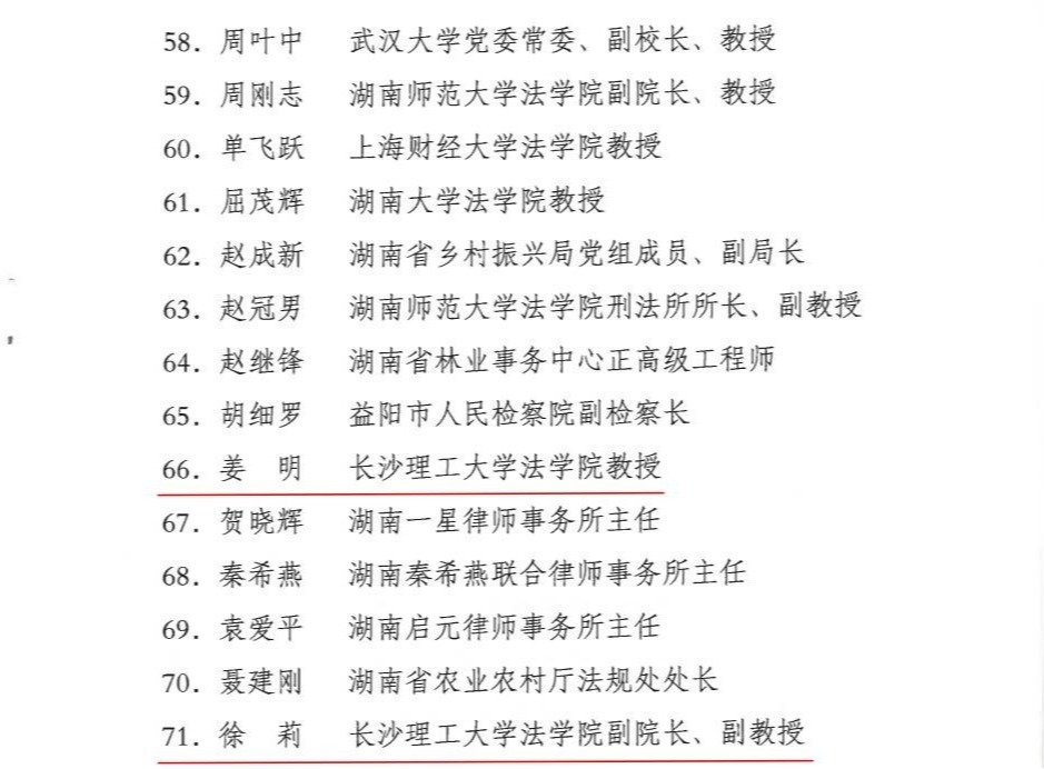 近日,省司法厅开展了湖南省政府立法专家选聘工作,我院院长张敏纯教授、姜明教授、副院长徐莉副教授三位老师受聘。