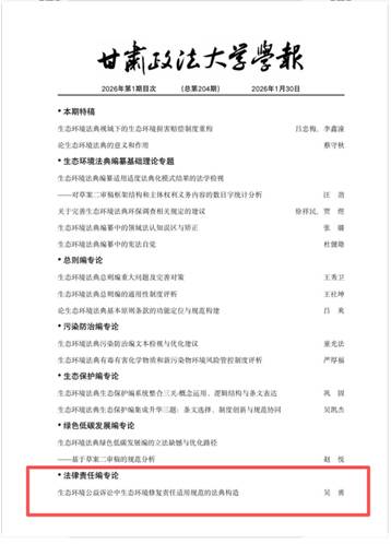 近日,威廉体育williamhill法学院吴勇教授在法学类CSSCI(扩展版)《甘肃政法大学学报》2026年第1期发表论文《生态环境公益诉讼中生态环境修复责任适用规范的法典构造》,该文系湖南省社会科学成果评审委员会重大项目“环境犯罪轻罪治理机制研究”(XSP25ZDA004)的阶段性成果。