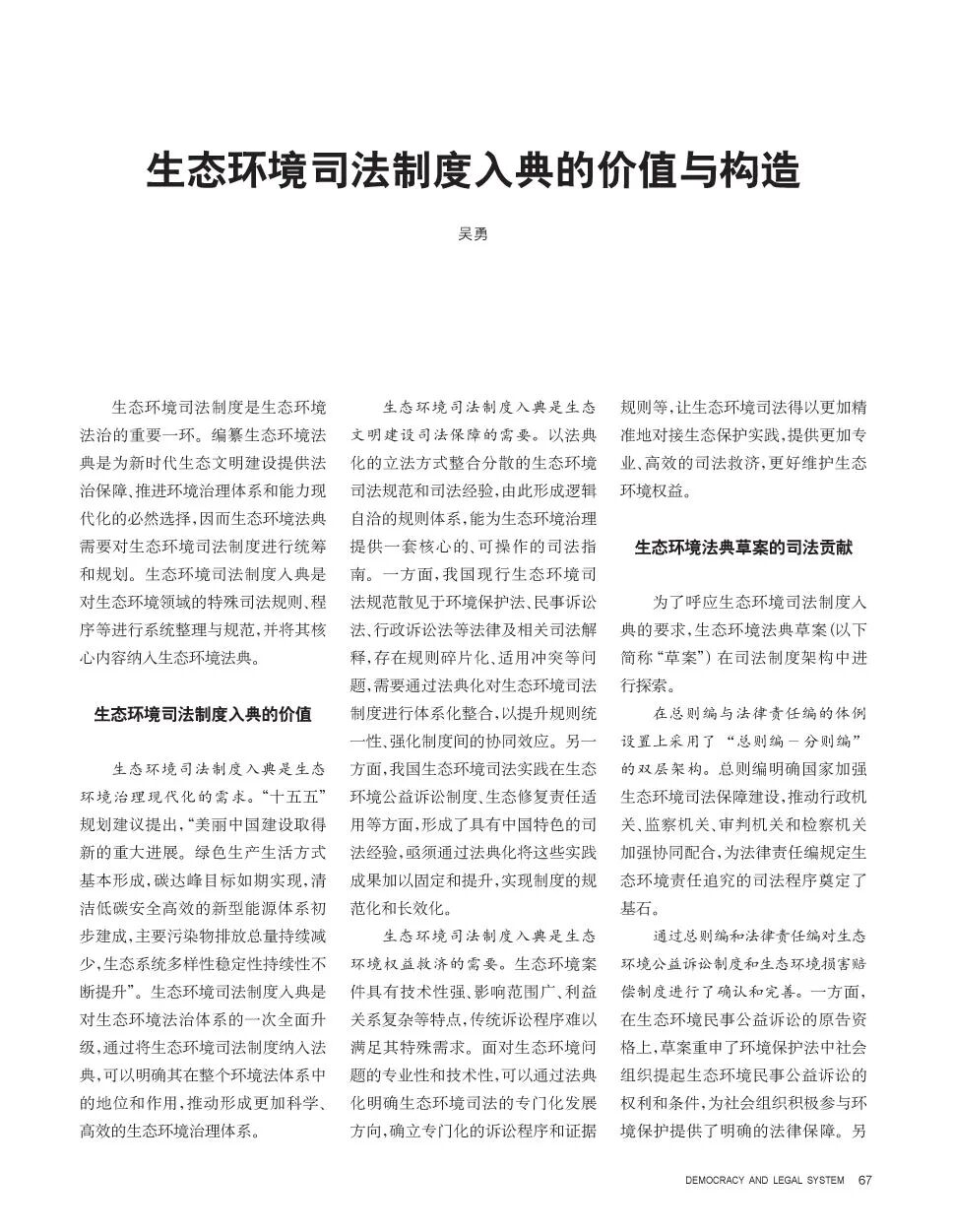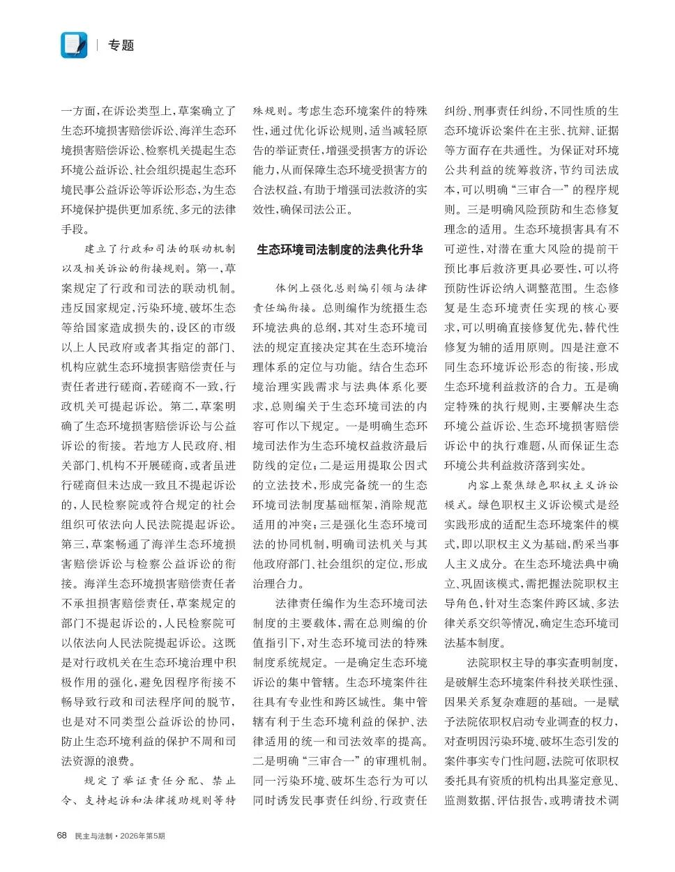 近日,威廉体育williamhill法学院学术院长、教授吴勇在《民主与法制》2026年第5期发表《生态环境司法制度入典的价值与构造》一文。