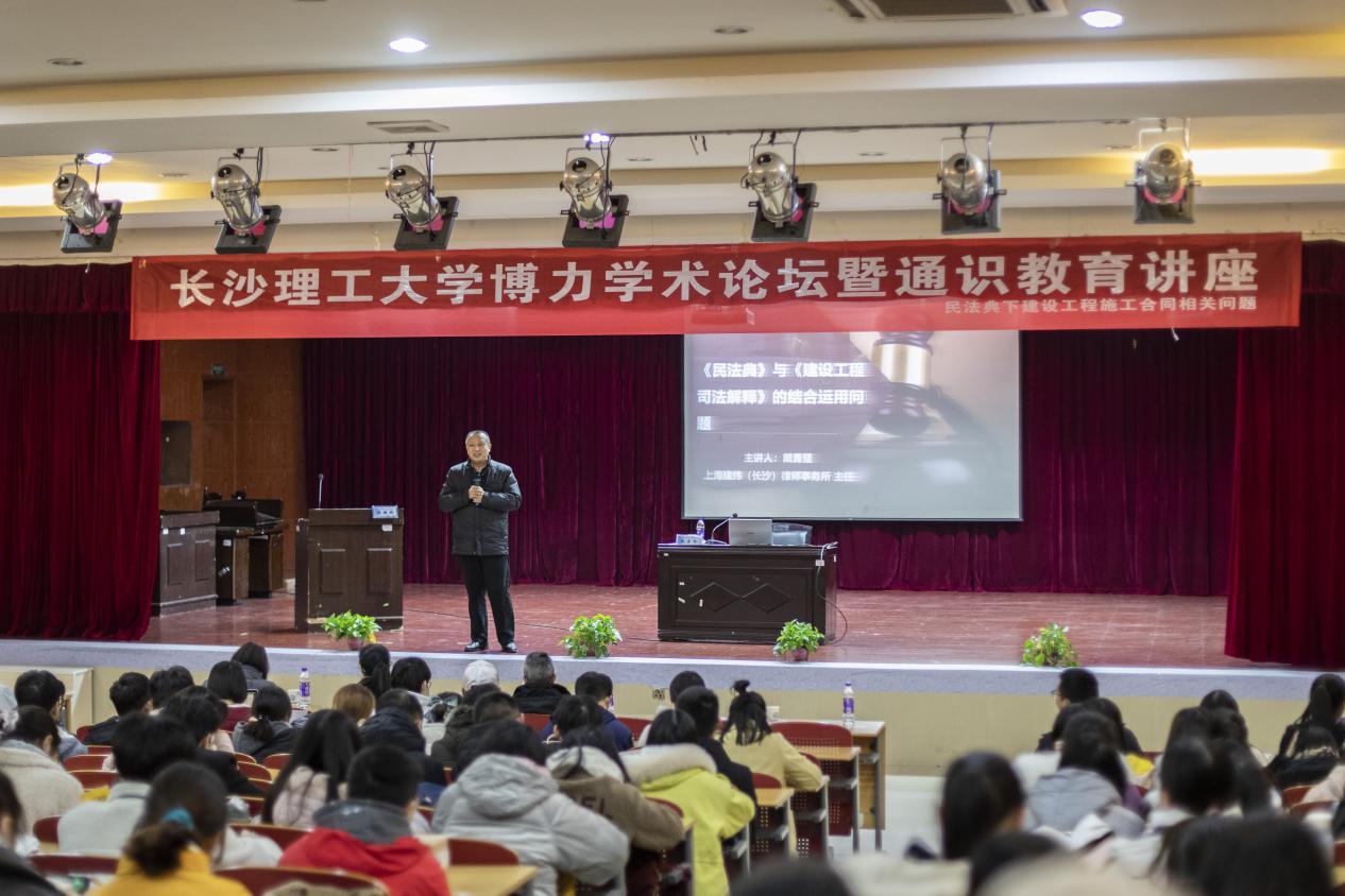 12月14日19:00,法学系于威廉体育williamhill云塘校区模拟法庭举办了以“民法典下建设工程施工合同相关问题”为题的学术讲座,本次讲座由上海建纬(长沙)律师事务所主任、威廉体育williamhill硕士生导师、湖南省工程法研究会副会长、湖南省律师协会副会长戴勇坚教授主讲,由威廉体育williamhill法学系副主任(主持工作)张敏纯主持。莅临本次讲座的有威廉体育williamhill法学学科带头人王新生教授以及法学系部分教师代表。
