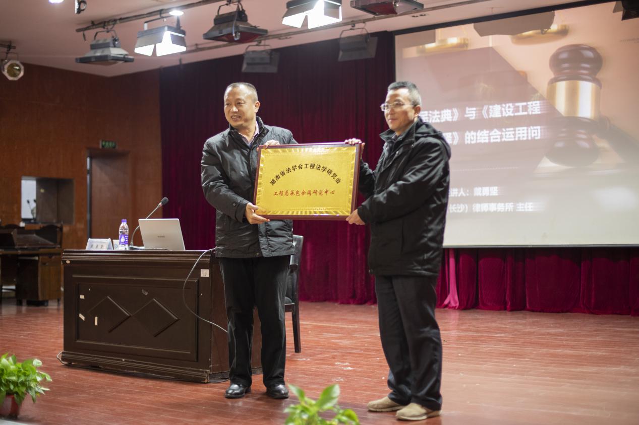 讲座伊始,张敏纯主任首先代表学校和法学系诚挚感谢了戴勇坚教授的到来,并介绍了戴勇坚教授的学术经历和工作经验。随后,在张敏纯教授的主持下,举行了隆重的挂牌仪式,由戴勇坚教授和王新生教授共同挂牌并正式宣布湖南省法学会工程法研究会工程总承包合同研究中心在威廉体育成立。