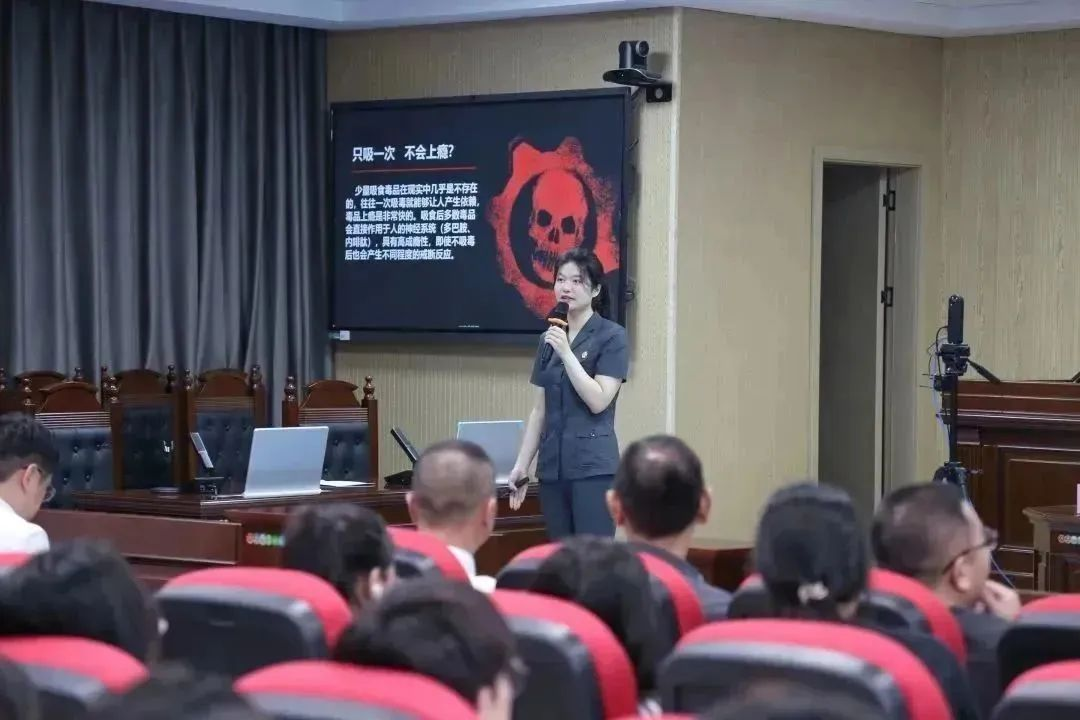 随后,天心区法院刑事审判庭法官刘希雅为同学们献上了一堂禁毒主题法治宣讲课,向同学们介绍新型毒品相关知识、防毒技巧和禁毒法规,精准提升在校学生识毒防毒拒毒能力,为助力青少年健康成长和筑牢全社会禁毒工作防线打下坚实基础。