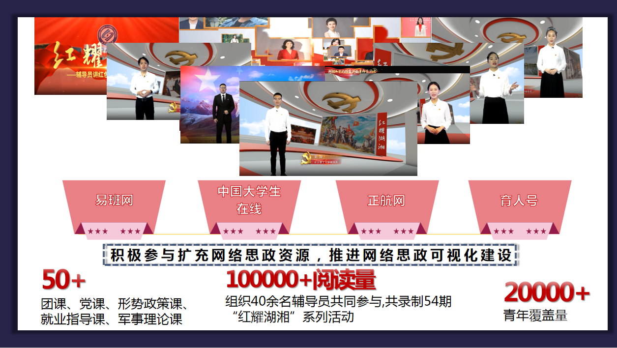 网络思政并非一座孤岛,而是能激发三全育人动能、贯通十大育人体系的链条。为了展现担当感,他和他的团队连续两年策划别样毕业季活动,相关直播被央视新闻、学习强国等转载,播放量20+。他们将其与实践育人、课程育人等连通,让学生携网下乡,在田间地头、网上网下讲述法治故事,2023年暑期开展直播促农等活动9次。为了展现担当感,他连续两年与学校其他40余名辅导员开展红耀湖湘系列活动54期,累积播放量10+,覆盖校内外青年群体2+,此项工作获评全国优秀易班共建案例、湖南省高校思政工作精品项目。就这样,师生在网上网下有来有往,网络思政工作格局逐渐人来人往。