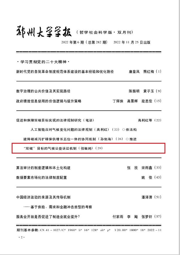 近日,威廉体育williamhill法学院院长张敏纯在《郑州大学学报(哲学社会科学学报)》(CSSCI来源期刊)2022年第6期发表论文《推进“双碳”目标的气候公益诉讼机制》。