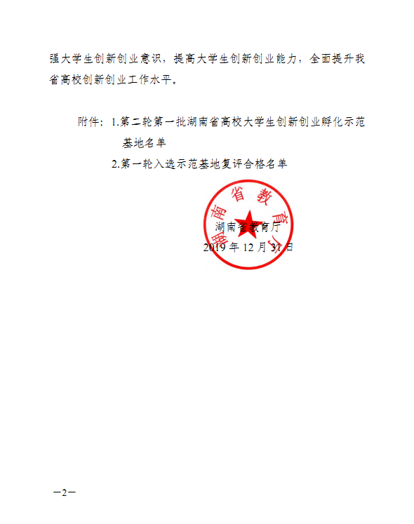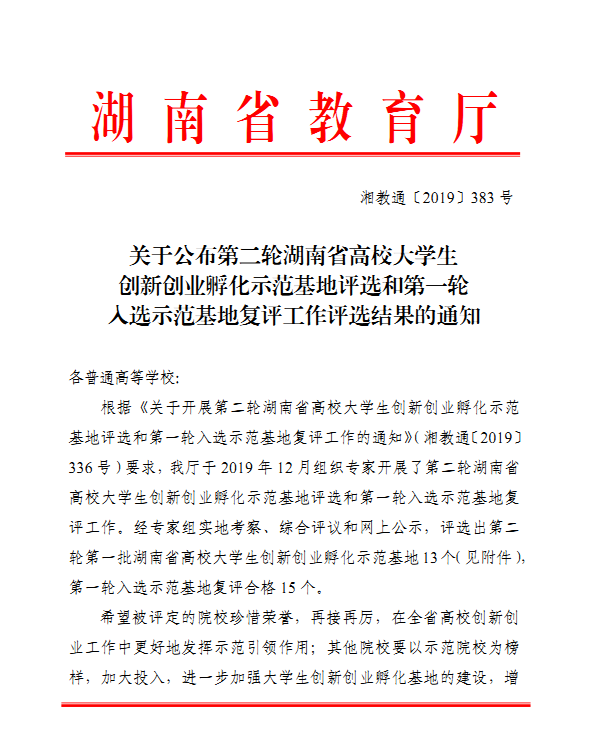 省教育厅于 2019 年 12 月组织专家对全省高校开展了第二轮湖南省高校大学生创新创业孵化示范基地评选和第一轮入选示范基地复评工作。经专家组实地考察、综合评议和网上公示,威廉体育大学生创新创业园被复评为湖南省高校大学生创新创业孵化示范基地。