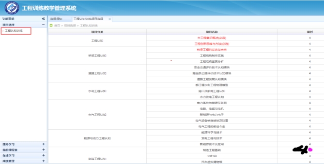3、选课操作如下图:登录后,先在左侧菜单栏点击“项目选择”,再点击课程 “工程认知训练”,右侧窗口弹出“工程认知训练项目选择”页面,该页面“项目分类”栏列出了13个项目类别;“项目名称”栏列出了43个项目,其中前两个是必修项目,后41个是选修项目(其中8个类别8个项目面向入住在金盆岭校区学生开课);“课时”栏列出了每个项目的教学时数。