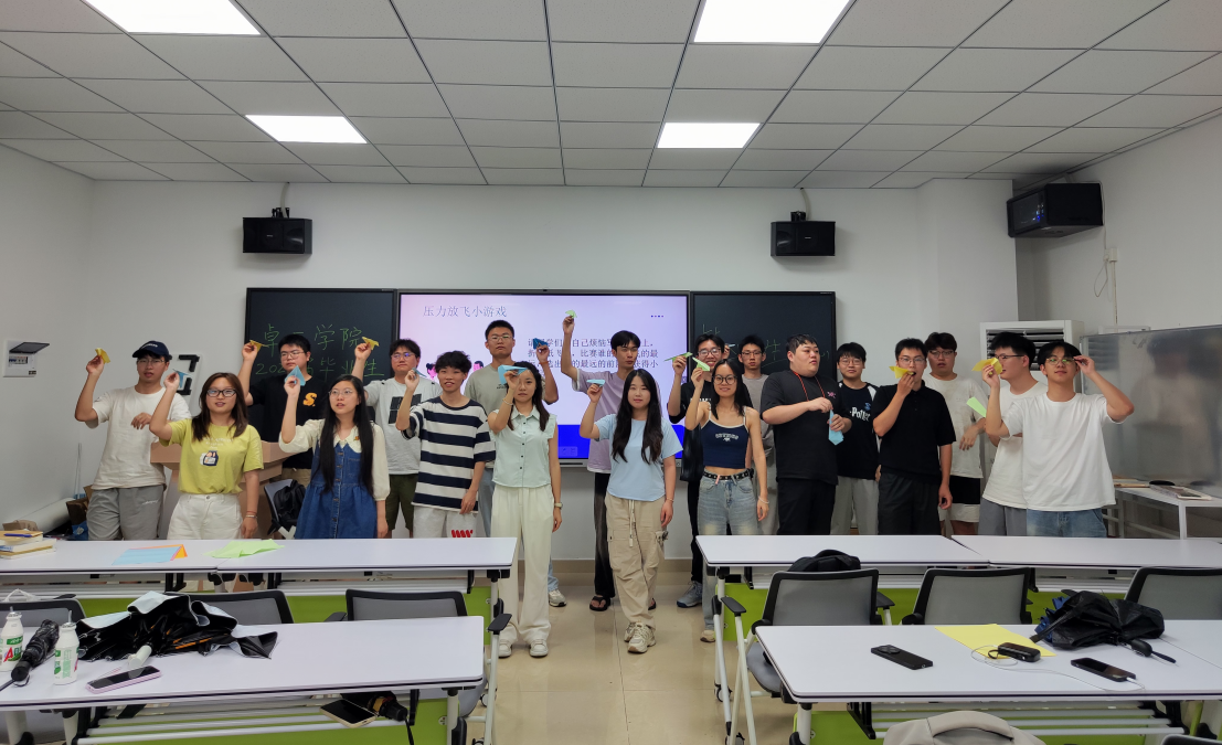 在“压力放飞”活动中,心委给每位同学发放彩纸,同学们在纸上写下近期困扰自己的压力或烦恼,随后将纸张折成纸飞机,集体放飞。这一环节不仅让同学们以象征性的方式释放压力,也让大家在集体行动中感受到彼此的支持。不少同学表示,看着纸飞机飞出去的瞬间,心情轻松了许多。