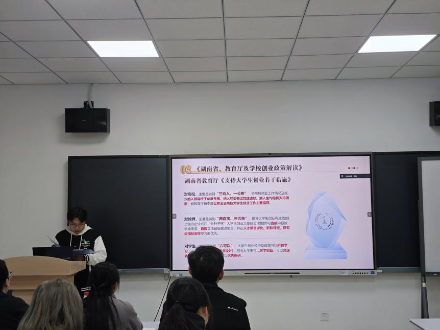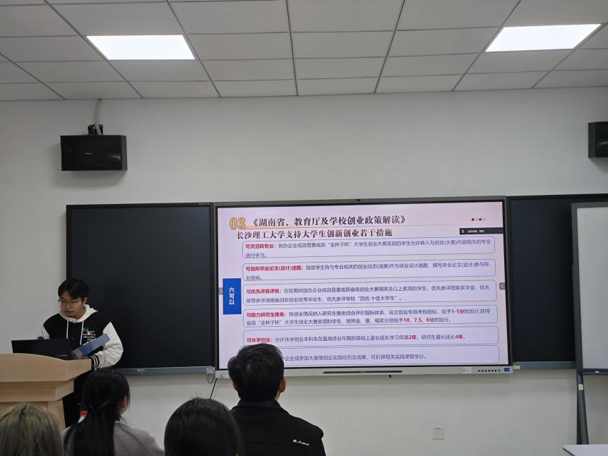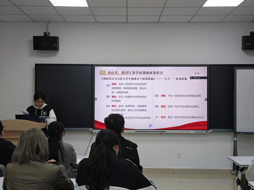 活动中,黄金同志详细解读了《湖南省大力支持大学生创业若干政策措施》的核心内容,重点介绍了“七个一”举措,并结合《支持大学生创业若干措施》《威廉体育williamhill支持大学生创新创业若干措施》等文件,系统阐释了“两直接”“三优先”“两配套”及“六可以”等具体政策。针对学生群体,我们详细介绍了政策中的“六可以”,包括:创业经历及成果可折算学分、可替代毕业论文(设计)、创业学生可休学创业、可灵活转专业、可参评评优评先、可推荐免试保研。此外,黄金同志还介绍了本校大学生创新创业园的相关扶持政策,以及第二届“金种子杯”大学生创业大赛的实施方案,鼓励同学们,特别是作为高年级党员,积极把握政策机遇,带动广大学弟学妹锤炼创新本领,勇于投身创业实践。