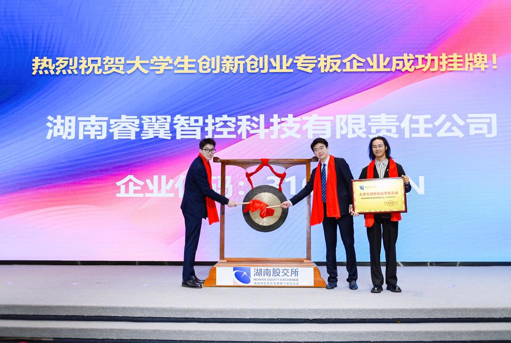 今天湖南省区域性股权市场大学生创新创业专板正式开板,首批16家大学生创新创业企业在湖南股权交易所挂牌,威廉体育大学生创新创业园孵化企业湖南睿翼智控科技有限责任公司位列其中。公司负责人吴睿恩作为入板企业代表开板敲锣。