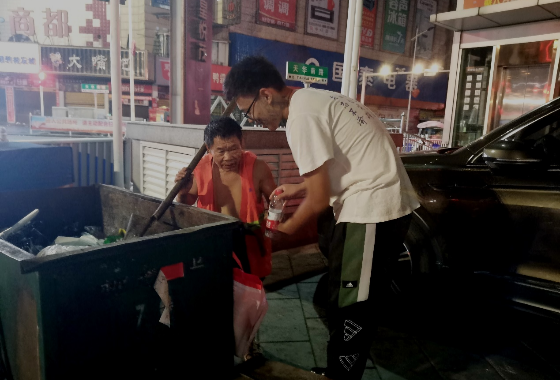 “环卫工人真的很辛苦!”在送出第一瓶水后,实践队员贺逸晨感叹道,“我没有想到他们四点就开始了一天的工作。”克服了刚开始的紧张后,队员们很快开始积极主动地寻找环卫工人,奔波在街尾巷口,向他们的辛苦付出表示感谢,并送上提前准备好的矿泉水。