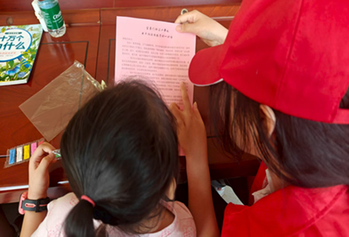 在宣传课堂上,实践队员李勃朗读着防溺水“六不准”原则和溺水自救知识。其他队员们发放画册,将生硬的文字转化为入耳入心的警示。在课堂上,队员们耐心地为孩子朗读了一则改编的防溺水小故事,用孩子能理解的方式,将安全意识的种子悄然播下。