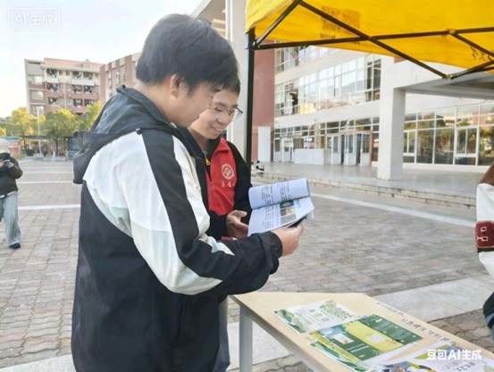 志愿者们化身“流动科普站”,带着宣传册走进校区周边的社区与街道,温柔交流间传递环保温度。遇到提着菜篮的阿姨,他们指着宣传册上的图标细细拆解“厨余垃圾怎么分类”;碰到带孩子的家长,又蹲下身用卡通插画轻声教小朋友认“哪些是可回收物”。一位接过宣传册的居民笑着说:“这些大学生娃娃讲得真明白,我们不光听得懂,往后也知道怎么做了!”