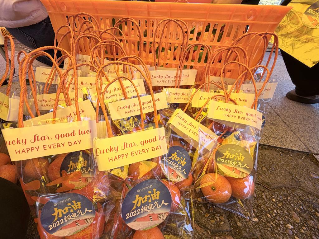 砂糖橘装入印有大吉大利的橙色礼品袋,并贴有学院专属标识,红蓝相映的图案与加油,2022级电气人的字样,传递出学院作为学子坚强后盾的温暖心意。