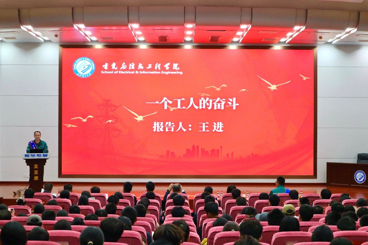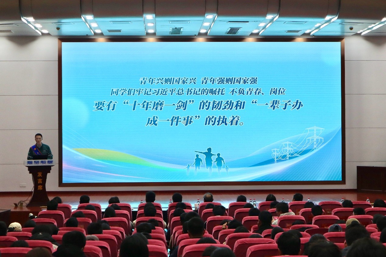 在随后的宣讲环节,国网山东超高压公司输电检修中心作业班副班长王进以《一个工人的奋斗》为题,讲述了其扎根基层、恪尽职守的朴实岁月;输电检修中心输电运维三班班长李敏则以《从铁塔到云端:一个“电网机长”的青春选择》为主线,分享了他在高压输电线路高空作业领域的探索历程与人生选择。他们用真挚而质朴的语言,将一线电力工人的坚守、担当与创新精神生动呈现,为在场学子带来了深刻启迪。