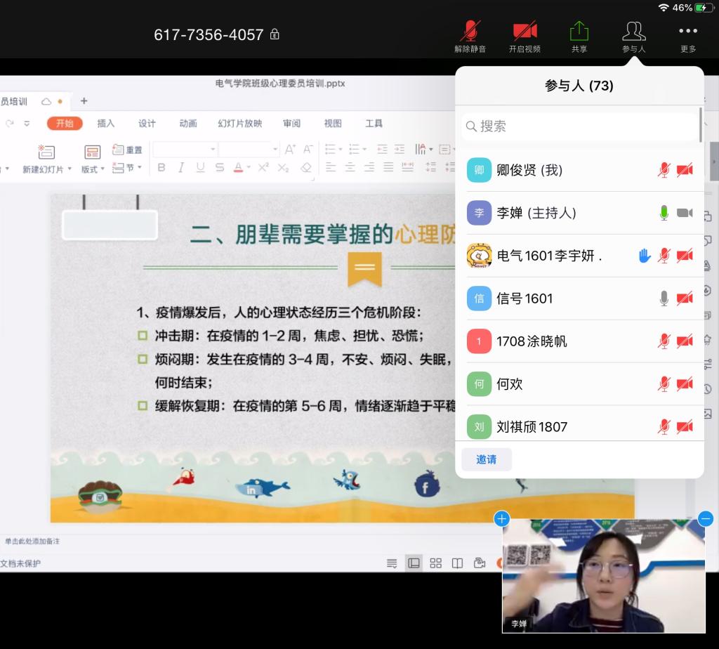 为进一步做好疫情期间心理健康教育知识普及工作,引导同学们调整心态同时帮助朋辈互助员提高工作能力416号晚7点30分,电气学院举行线上朋辈互助员心理防疫知识培训。此次培训由学院心理辅导李婵主讲73名朋辈互助员参加。