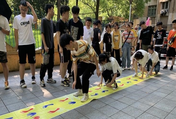 素拓总共设立四个游戏打卡点,率先完成打卡的队伍获胜。新朋辈们首先在操场集合,在完成简单的热身游戏后正式开始比赛。第一个打卡点在东操场,游戏为两人三足接力赛,朋辈们通过默契配合很快完成打卡任务;第二个打卡点在东苑幼儿园西侧空地,游戏名为“手忙脚乱”,红色代表左,蓝色代表右,按照地面上标志指示前行;第三个打卡点在电苑楼前坪,游戏为速度接力,依次进行摸石过河、不倒森林和指压板跳绳三个关卡闯关;第四个打卡点在西操场,进行“绷带袋鼠跳”游戏,游戏中同学们腰间缠上长绷带通过旋转传递后进行袋鼠跳前进。