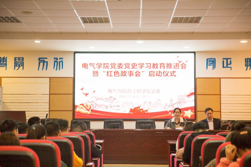 4月141930,电气学院学生党史学习教育推进会暨“红色故事会”启动仪式在工号楼B503召开,学院党委副书记任艮丰、辅导员教师及120余名学生党员、干部参加,会议由学生党总支副书记邵巧艳主持。