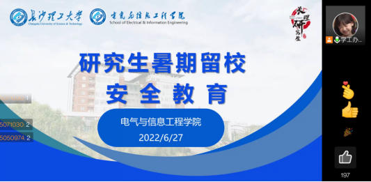 2022年暑假将至,为进一步做好研究生暑期教育管理和服务工作,加强广大留校研究生暑期的安全防范意识,及时掌握在校学生相关情况,627日,电气学院于线上召开研究生暑期留校安全教育大会。会议由研究生辅导员杨湘怡主讲,李晨璐主持,全体留校研究生参会。