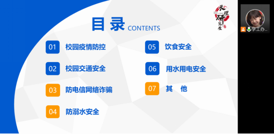 杨湘怡分别从疫情防控、假期管理制度、交通安全、防网络诈骗、防校园贷、防溺水、饮食安全、用水用电安全等方面展开了详细的安全主题教育。她强调,暑期留校研究生日常管理工作不容松懈,留校学生必须坚持每日钉钉打卡、每周位置签到,坚决克服侥幸心理、松劲心态,认真落实落细各项防控要求,服从学校及学院管理。此外,她通报了学校暑期施工安排,提醒留校生提前做好准备工作,提高安全意识。