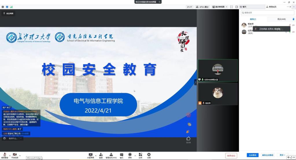 4月22日晚,电气学院召开研究生安全教育线上会议,会议由研究生辅导员杨湘怡主持,电气学院党委副书记任艮丰主讲,全体硕博研究生参会。