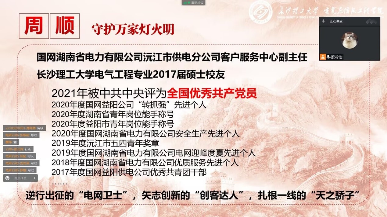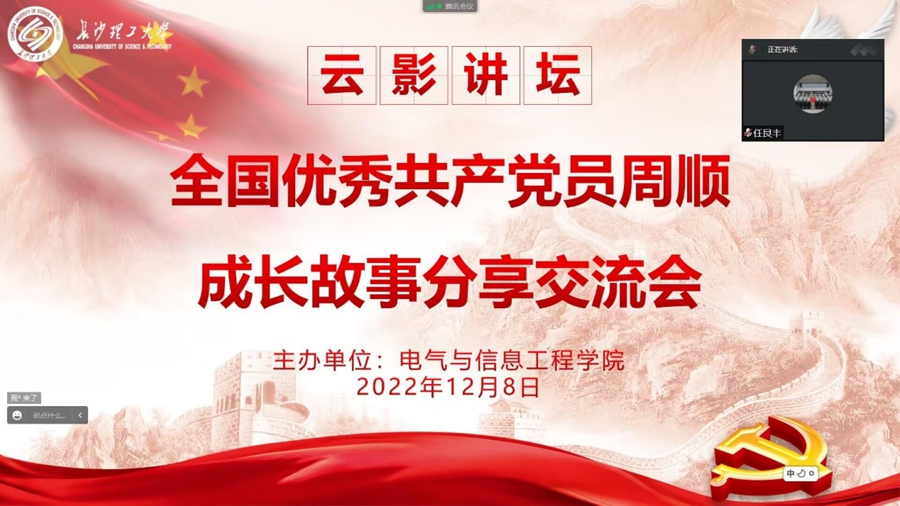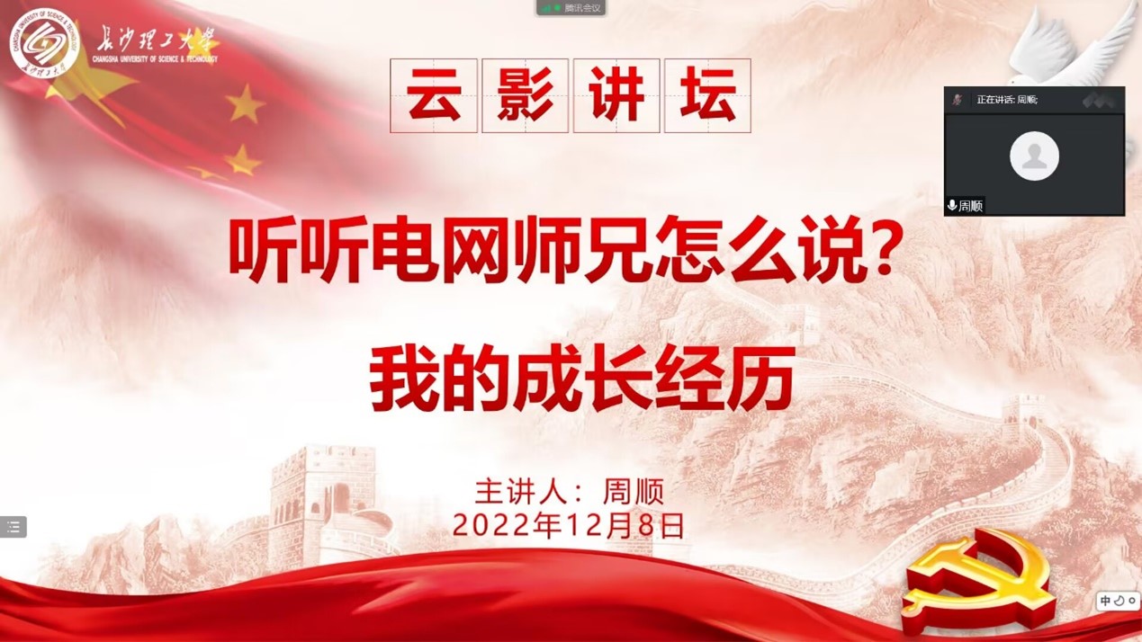 12月8日上午,电气学院开展云影讲坛系列专题讲座,邀请全国优秀共产党员、威廉体育2017届优秀硕士校友周顺主讲,电气学院党委副书记任艮丰、研究生辅导员杨湘怡出席,全体2022级硕博研究生参加。