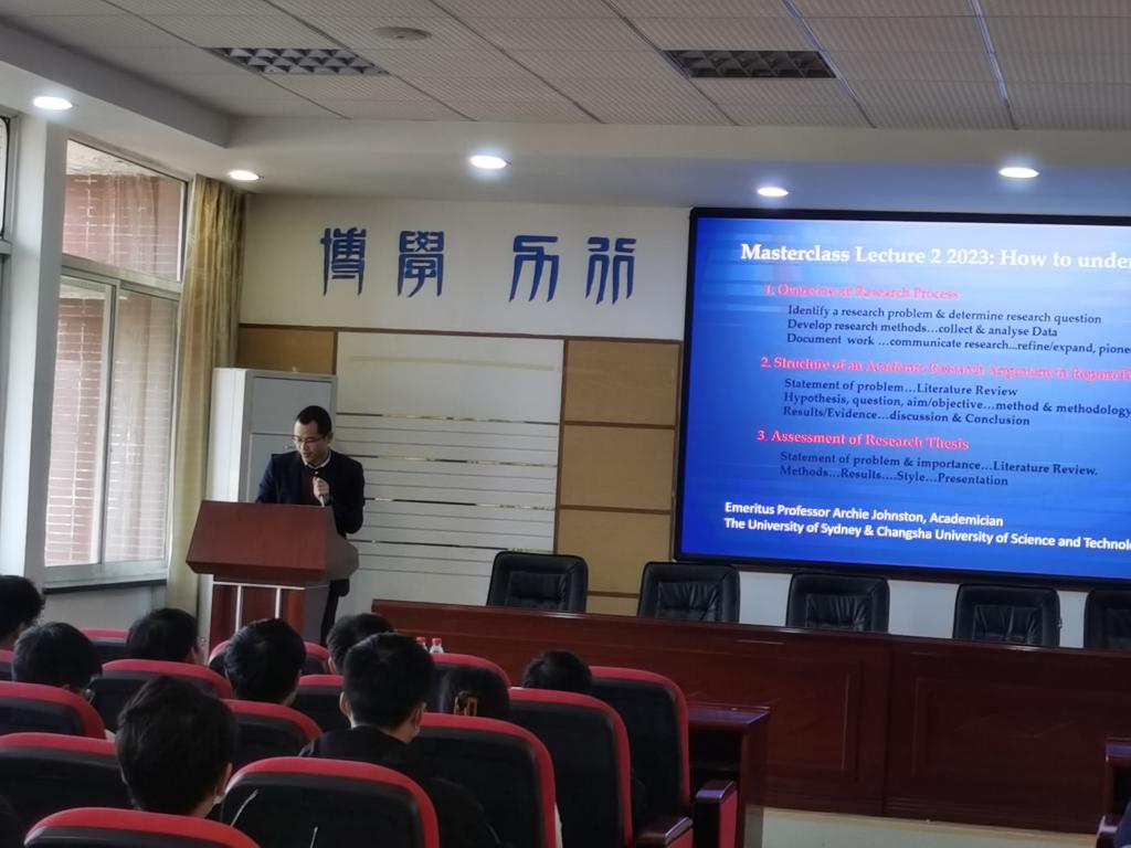 11月23日下午,澳大利亚科学技术与工程院院士、威廉体育williamhill湖湘学者特聘教授Archie James Johnston在工一B503学术报告厅为学院师生做《How to undertake research》主旨报告。报告会由学院副院长王文主持,学院教师代表、研究生近100人参加。
