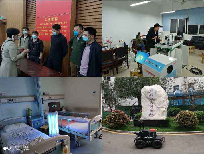 疫情发生后,张辉老师团队与湖南省人民医院主动对接,研制了两款防疫消毒机器人,并已在湖南省人民医院的病房和公共场所得到应用。周峰和蔡辉两位年轻博士主动承担了与上海观道生物科技公司对接开发联合研发中药自动配药机的任务,为了提高配药速度和精度,他们放弃休息时间,一直呆在实验室加班加点,不断改进方案,为科学抗疫提供技术支持。