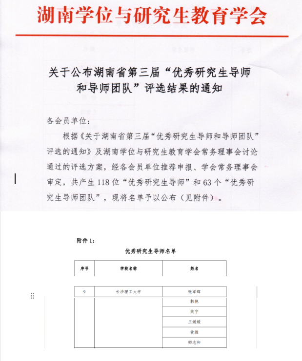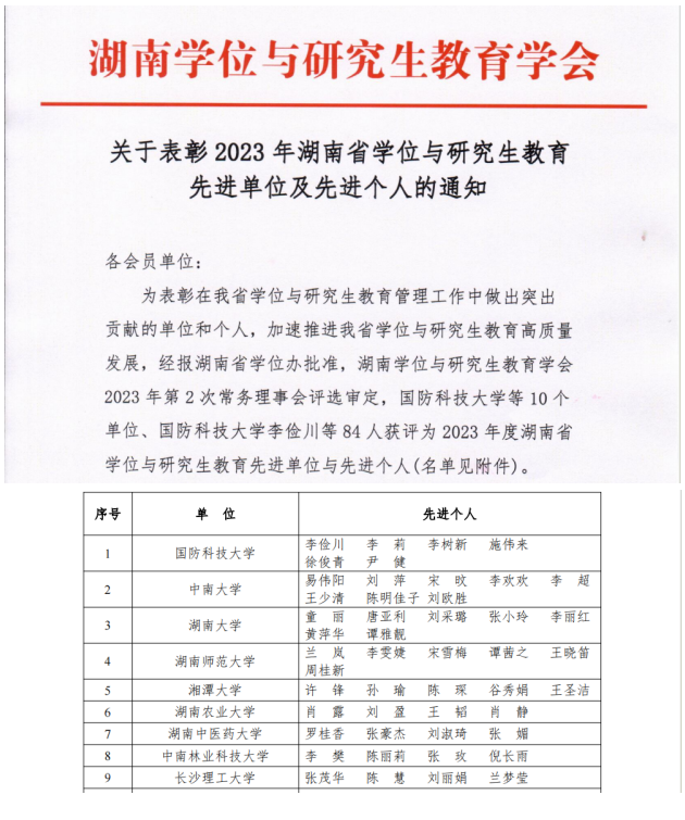 经学院和学校推荐,湖南学位与研究生教育学会评审,我院王媛媛教授荣获湖南省第三届“优秀研究生导师”称号,兰梦莹老师荣获湖南省学位与研究生教育“先进个人”称号。