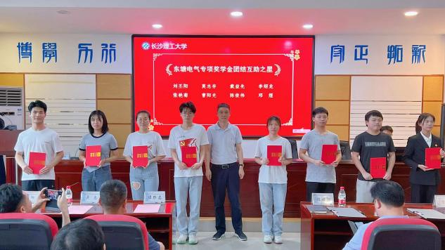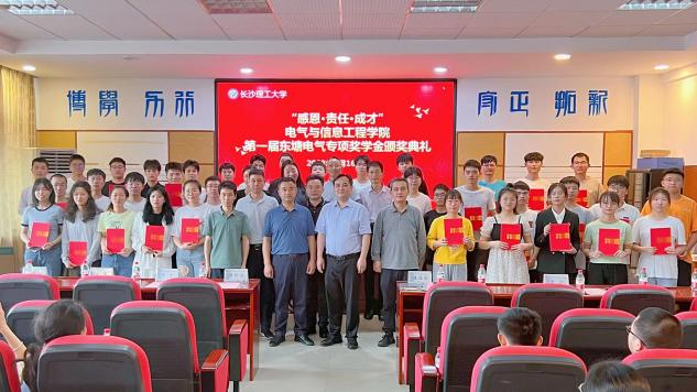 “东塘电气专项奖学金”由郴州市东塘电气设备有限公司出资设立,用于奖励我院家庭经济困难、自强不息、品学兼优的大学生和学生干部。颁奖典礼上,伍接朝代表学院对郴州市东塘电气设备有限公司的慷慨捐赠表示衷心感谢,对获奖的同学们表示热烈的祝贺。他回顾了过去一年学院在学术科研、人才培养、学科建设等方面取得的成就,希望与企业进一步推动产教融合,通过校企合作为祖国的电力事业培养更多人才,同时勉励同学们牢记总书记嘱托,胸怀天下立大志,培根铸魂明大德,锐意进取成大才,实干笃行担大任,在真刀真枪的奋斗中成就一番事业,为祖国的建设与发展贡献长理电气智慧与力量。