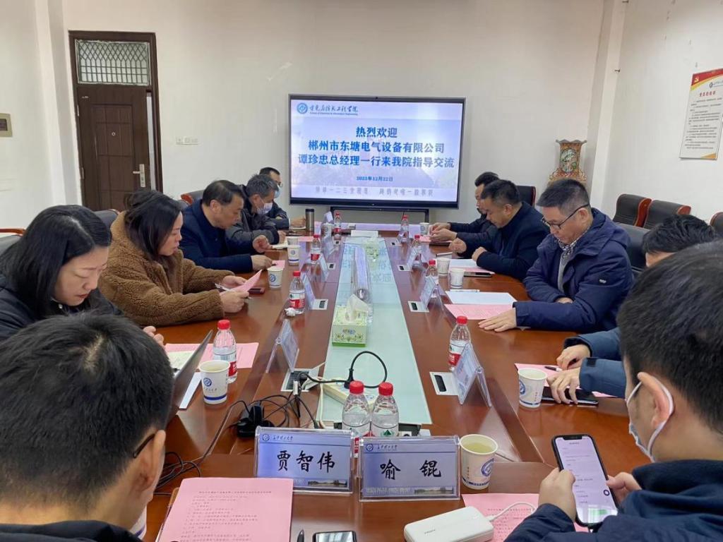 12月22日上午,郴州市东塘电气设备有限公司总经理谭珍忠一行来学院就人才培养、科技合作等问题调研交流,学院党委书记丁丹、副书记陶双、副院长唐欣、副院长王文以及相关教师代表参加。