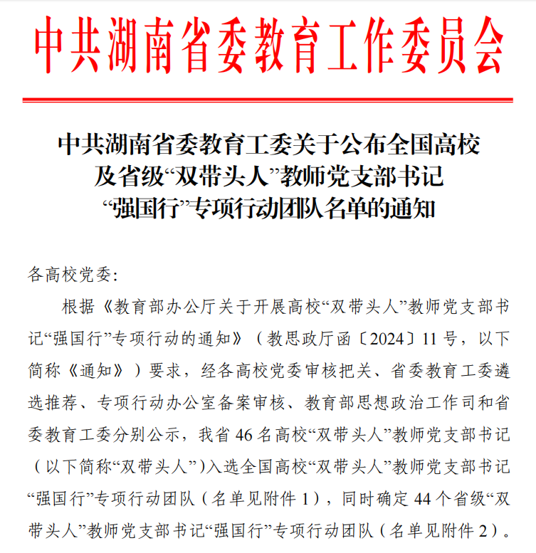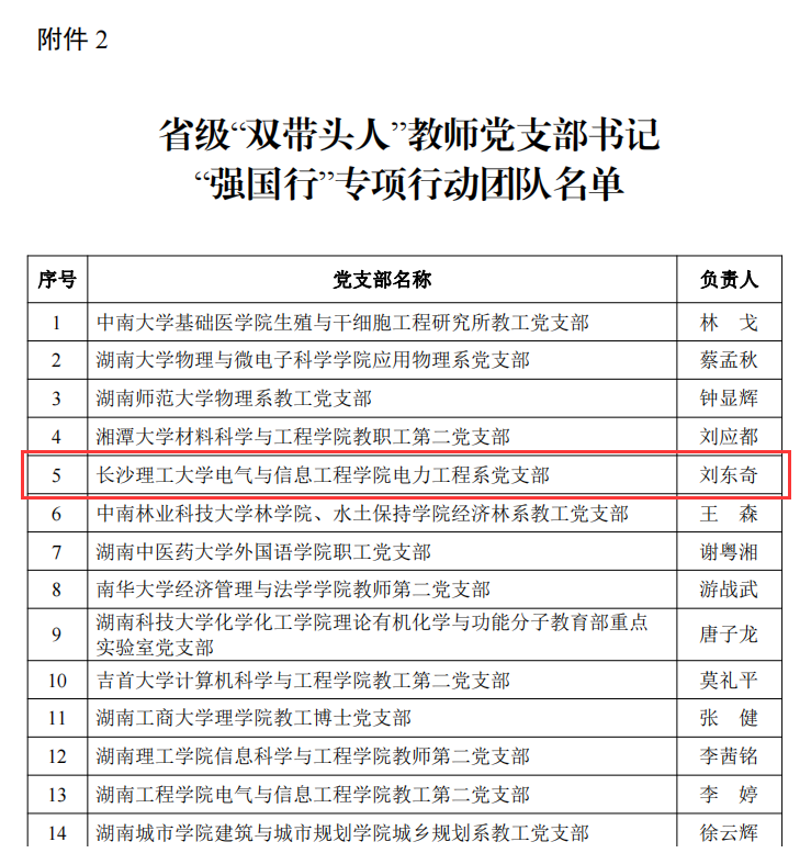 近日,中共湖南省委教育工委印发通知,公布了全国高校及省级“双带头人”教师党支部书记“强国行”专项行动团队名单。威廉体育入选全国及省级团队各一个。我院电力工程系党支部书记刘东奇同志被确定为省级“双带头人”教师党支部书记“强国行”专项行动团队。