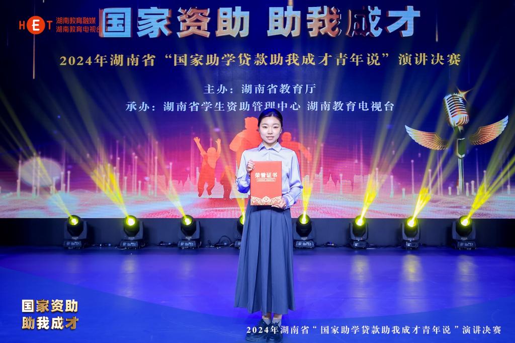1213日,由湖南省教育厅主办,湖南省学生资助管理中心与湖南教育电视台联合承办的2024年湖南省国家助学贷款助我成才青年说演讲活动决赛,在长沙隆重举行。经过激烈角逐,我院乔梦雪同学以出众的表现脱颖而出,荣获决赛一等奖