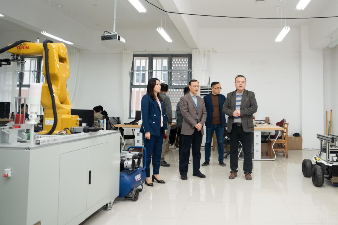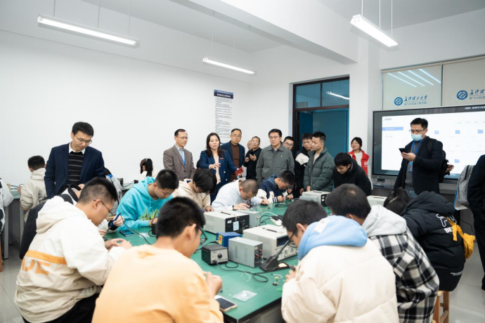 丁丹对双创中心的设置、布局进行了详细的讲解。专家参观了现场学生们的实验过程。