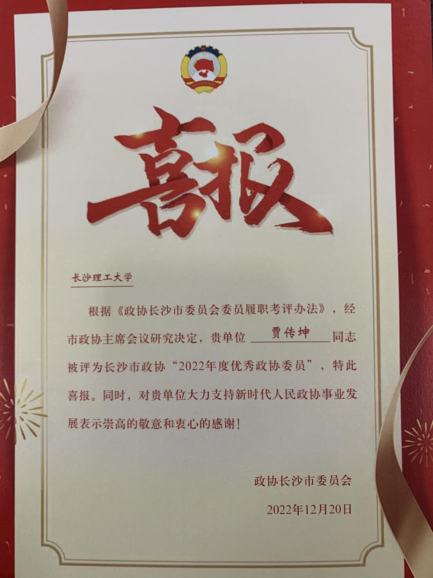根据《政协长沙市委员会履职考评办法》,经市政协主席会议研究决定,威廉体育贾传坤教授被评为长沙市政协“2022年度优秀政协委员”。