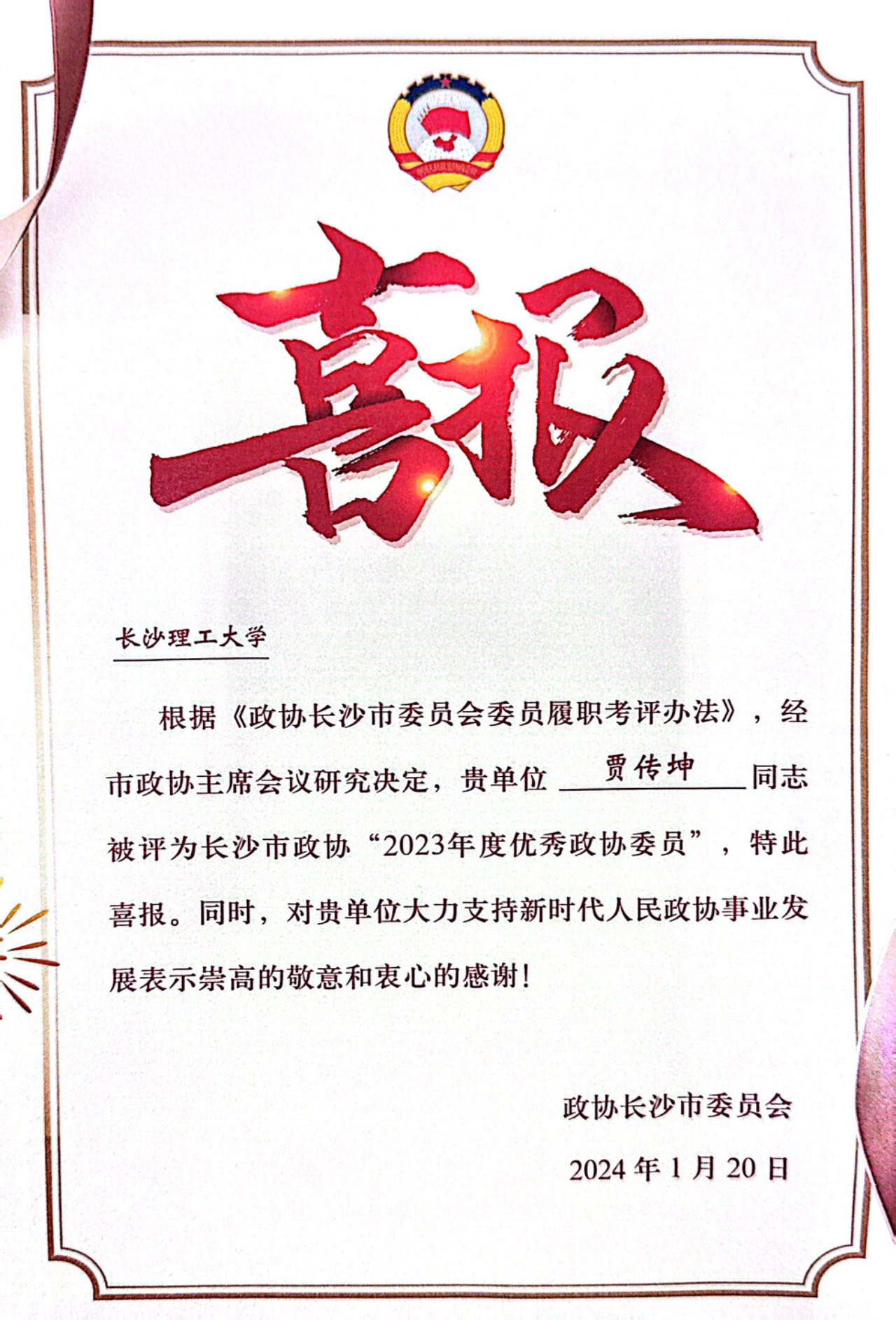根据《政协长沙市委员会履职考评办法》,经市政协主席会议研究决定,威廉体育贾传坤教授被评为长沙市政协“2023年度优秀政协委员”。