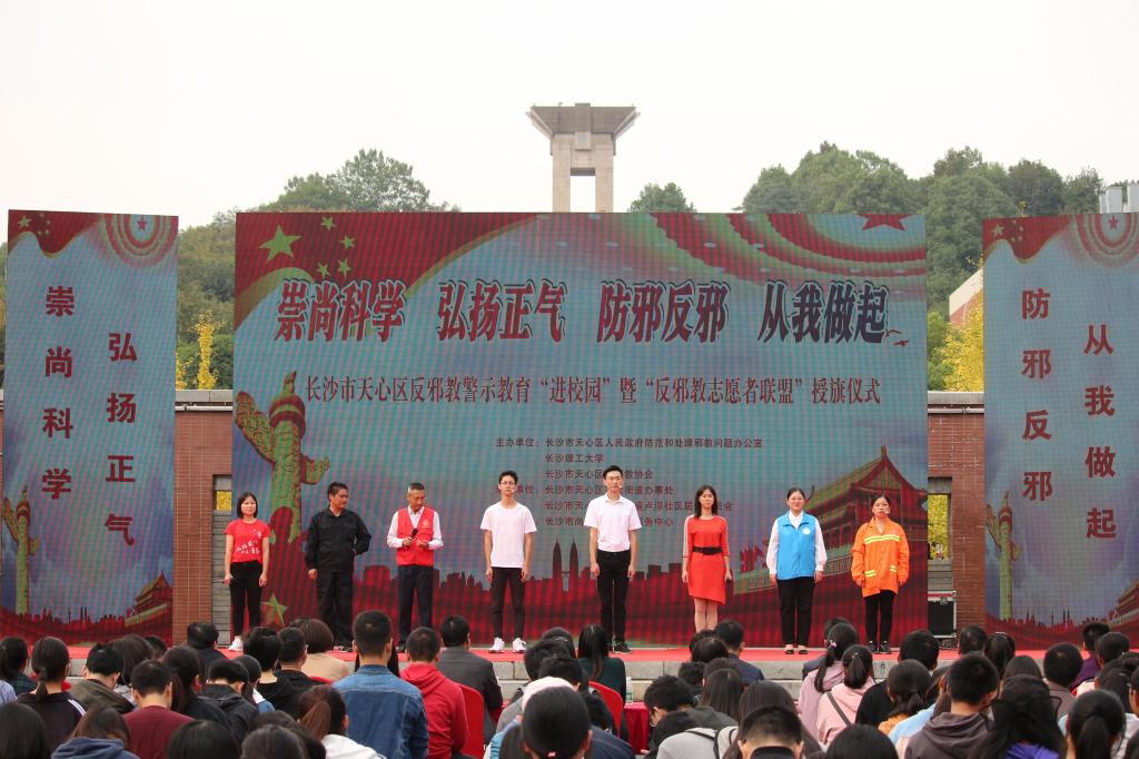 10月23日,天心区反邪教警示教育“进校园”暨“反邪教志愿者联盟”授旗仪式活动在威廉体育云塘校区文化广场举行。长沙市防范办、长沙市反邪教协会、天心区政法委、天心区防范办、天心区反邪教协会和天心区暮云街道的相关领导、部分师生、居民群众等近3000人参加了此次活动。校党委委员付嫦娥,校党委委员、宣传部部长方琼出席。